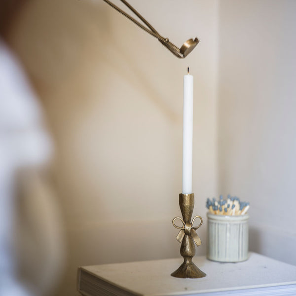 A charming addition to festive tables and year-round displays, this antique brass finish candle holder is cast from iron in a classic silhouette, complete with a subtle bow detail at the base.