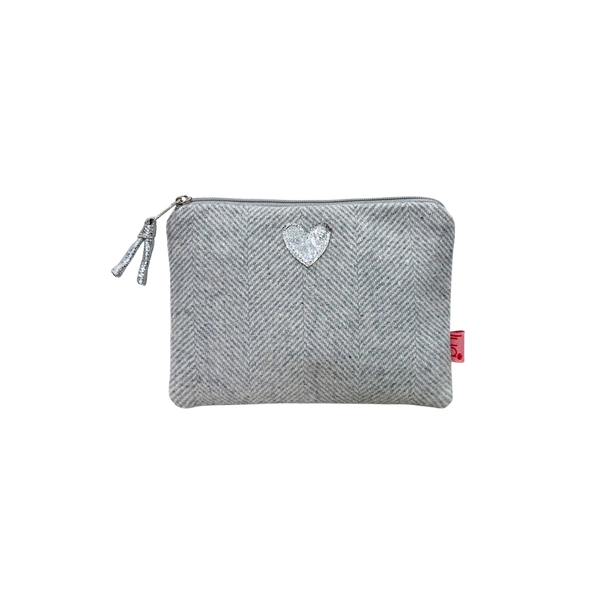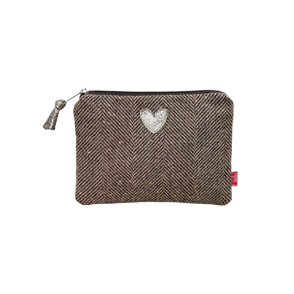 These lovely wool, herringbone purses feature a simple embroidered heart, and a metallic ribbon zip pull.