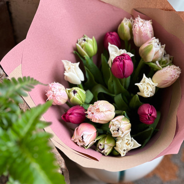Each bunch will contain 20 stems of the prettiest, unique variety tulips, grown here in the UK. The bunches will include 4 different varieties (see this years pick on the second picture), and will be wrapped in pink brown paper and finished with a pretty satin ribbon.